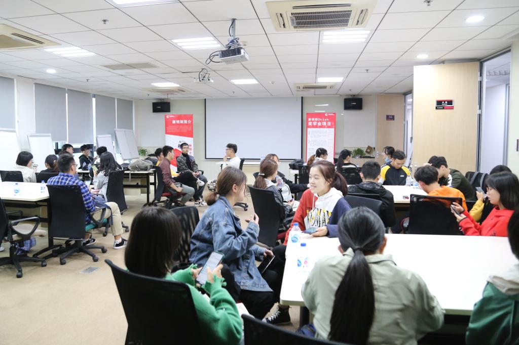 林博士项目负责人Sherry Chen讲解了今年奖学金项目的各个课题以及评分标准,给同学们的课题设计、答辩提供了建议。Jori Huang给同学们分享了学习、工作的亲身经历,从“认识自己”、“认识职业世界”、“确定职业方向”三个方面提供了职业生涯规划方面的建议。