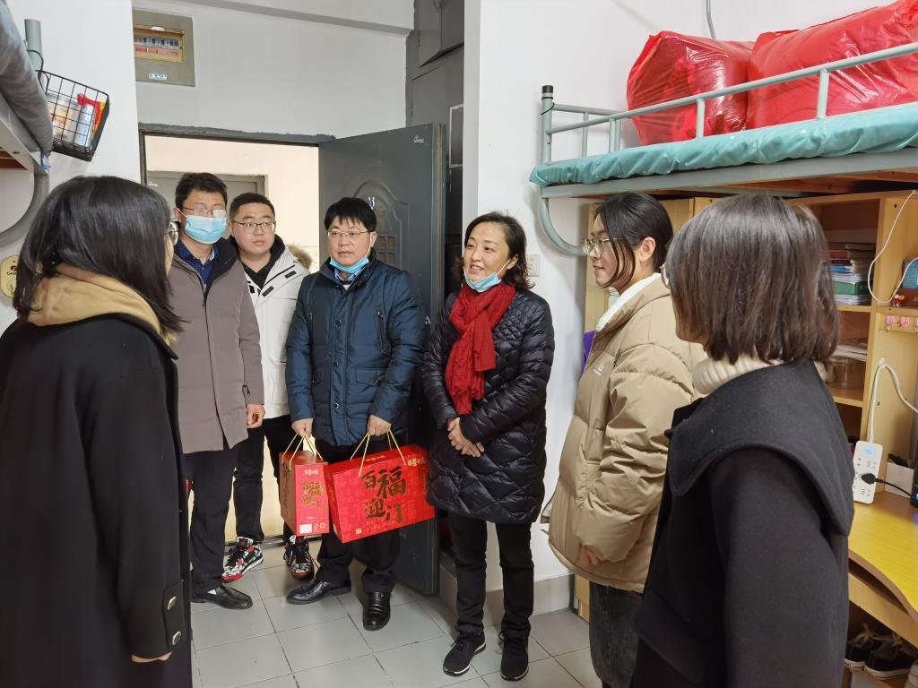 高雪梅带队走访宿舍并亲切询问学生留校生活与学习情况,叮嘱学生做好个人防护,注意宿舍安全,遵守学校各项疫情防控规定;多与父母联系,要视频拜年,关心家人健康;鼓励学生充分利用在校时间,度过一个充实、温暖、特殊的在校假期与春节。随后,老师们送上新春礼盒、新年挂饰、防疫物资、新年午餐券及新春祝福。同学们对老师们的殷切关心表示感谢,表示会遵守相关规定,常与家人联系,珍惜假期时间,不断充实自己。