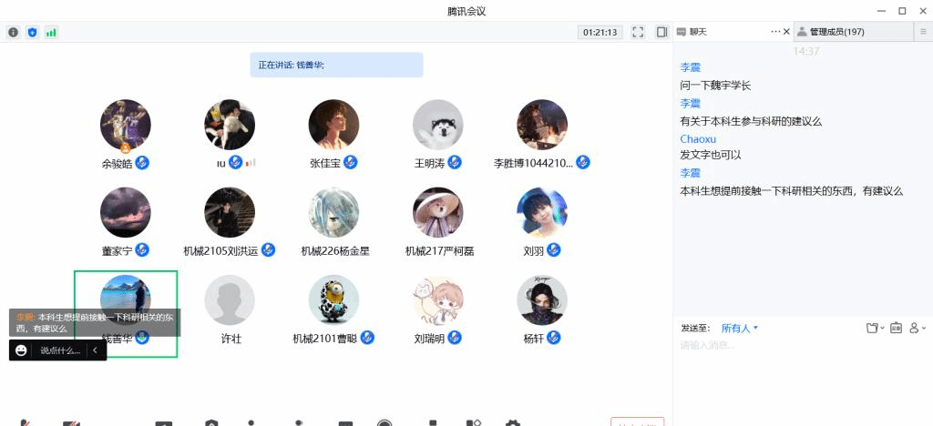 机械工程专业2007届校友、Eaton Electrical集团亚太区工业工程经理史朝旭,机械工程专业2019届校友、北京理工大学宇航学院博士生魏宇。机械设计与制造系主任钱善华教授、先进制造党支部书记纪小刚副教授、年级辅导员余骏皓、专业教师代表和2021级学生共200多人参加交流会,会议由钱善华主持。