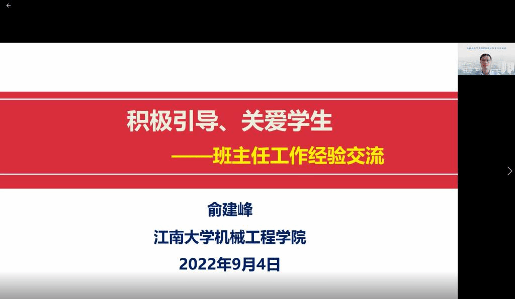 优秀班主任”荣誉称号的俞建峰、宿磊两位老师从班主任工作理念、实际工作案例分享了自己的班主任经历。俞建峰从四个方面聚焦班主任职责:引导学生对大学生活树立正确观念、指导班干部管理好班级、引导学生树立正确的升学就业观念、关心班级困难同学,并综合新时代大学生成长特点与大学生发展的新形势,给出了具体可行的指导建议。宿磊分享了班主任工作的三心:爱心、关心、用心。他表示,爱心是关心与用心的基础;关心不只局限于学习,还包括生活、家庭、人际处理等;用心是指要从学生成长出发,切实帮助学生设计规划自身发展。