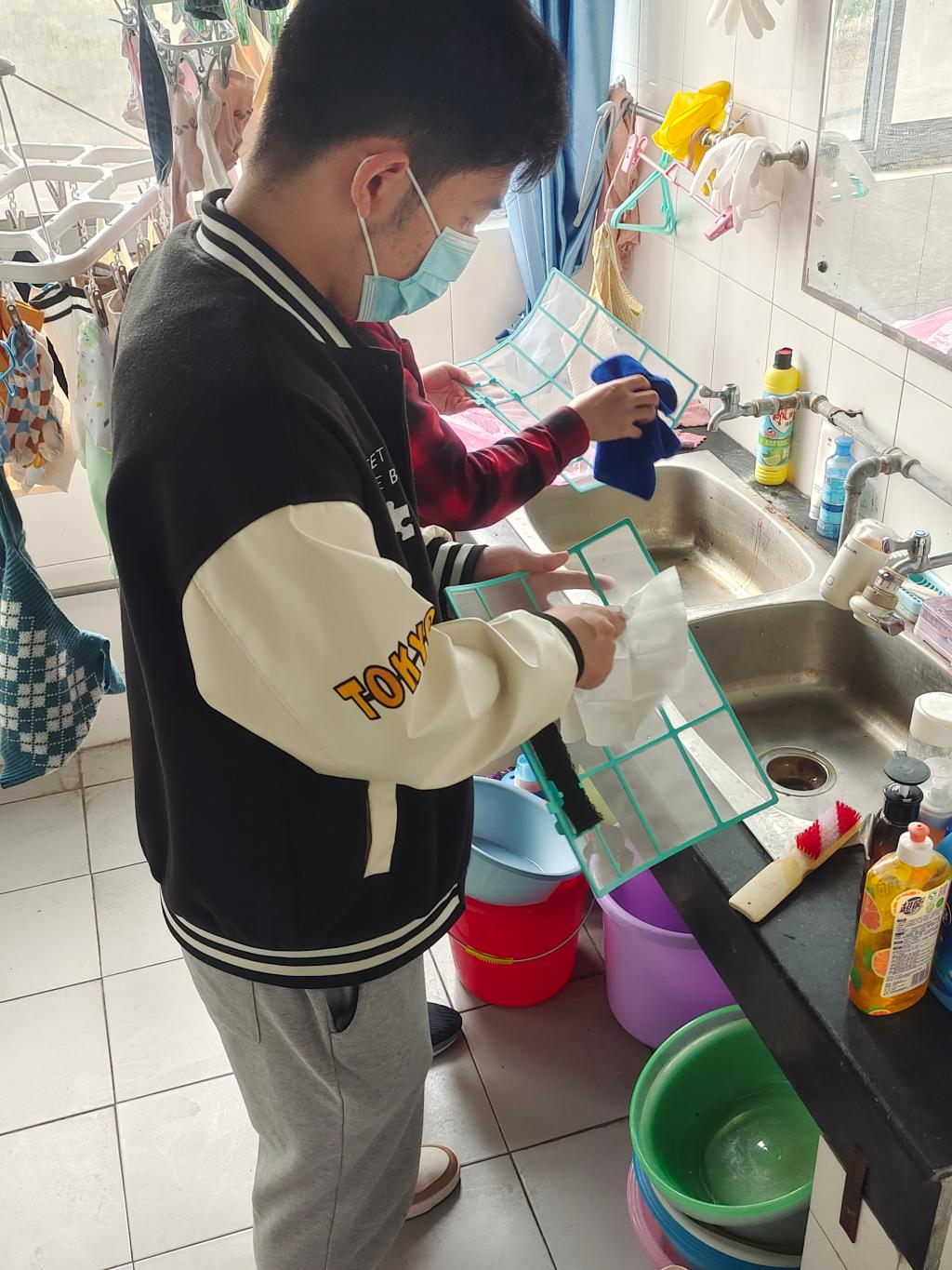 在志愿服务正式开展前,黄丽萍向同学们发放工具、示范空调滤网清洗的步骤,并对同学们积极参与园区志愿服务表示感谢。余骏皓为志愿者们进行分组、分楼层、分宿舍,叮嘱学生认真清洗的同时要注意安全。在所有志愿者的努力下,经过一下午的辛勤劳作,榴园16号楼82个寝室的空调过滤网均清洗干净,为还未到来的夏季酷暑提前做好了“降温”准备。