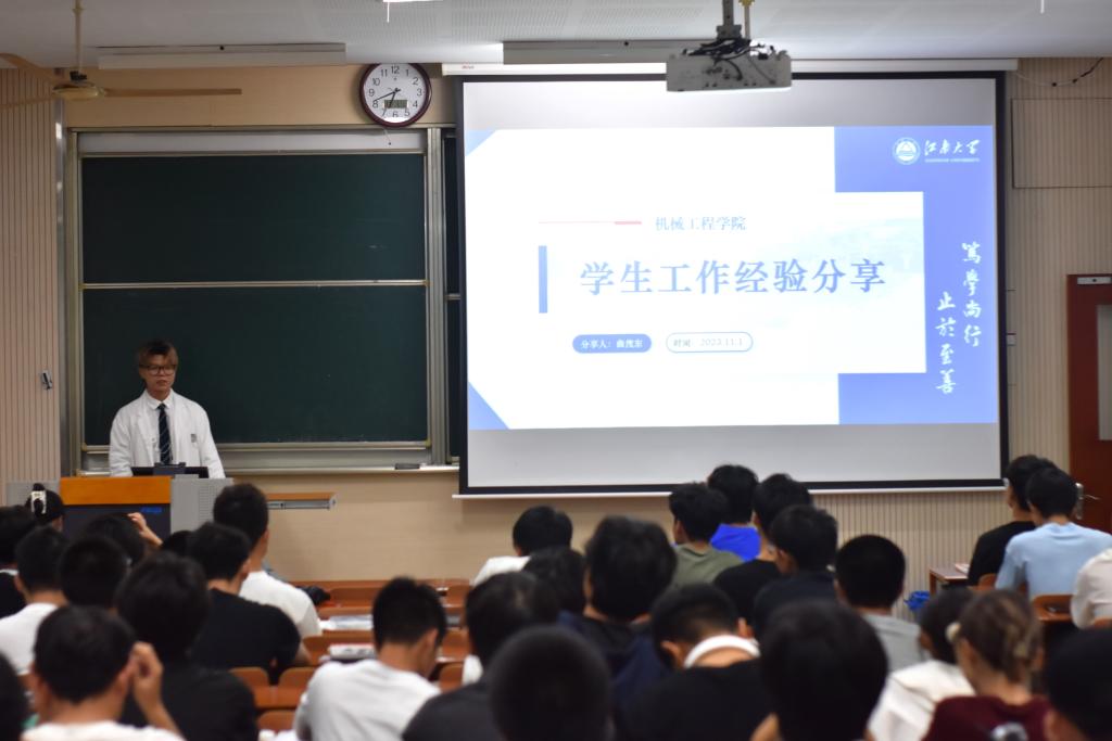 王谡阳分享了自己在本科毕业后加入研究生支教团,来到云南芒宽中学支教的故事,他用幽默风趣的语言讲述了他在支教期间与班上最调皮的“篮球冠军”之间的感人故事,向同学们分享他在支教时的点点滴滴。最后他用习近平总书记在庆祝中国共产主义青年团成立100周年大会上的讲话“奋斗是青春最亮丽的底色,行动是青年最有效的磨砺。有责任有担当,青春才会闪光”来勉励大家,鼓励同学们用江南力量践行江南青年对国家的赤子之心和报国之志。