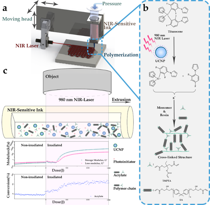 图1(a)近红外辅助3D打印技术和(b)增材制造的多色彩、高性能聚合物部件