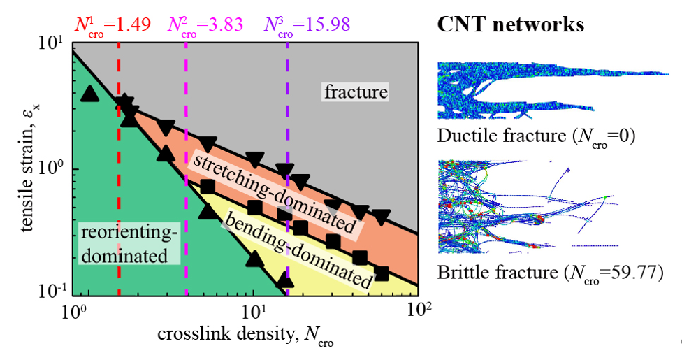图1.不同交联密度和拉伸应变下碳管网络主导变形模式的“相图”和韧脆转变的模拟图。