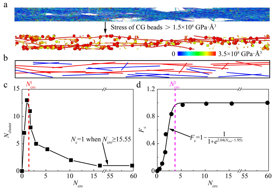 图2.粗粒化分子动力学模拟中(a)交联碳管网络(Ncro =1.66)在应变为3.34时的应力云图和局部放大图。(b)连续载荷传递路径示意图。负载和非负载团簇分别以红色和蓝色表示。碳管网络中交联密度与(c)团簇数量和(d)团簇因子关系曲线。