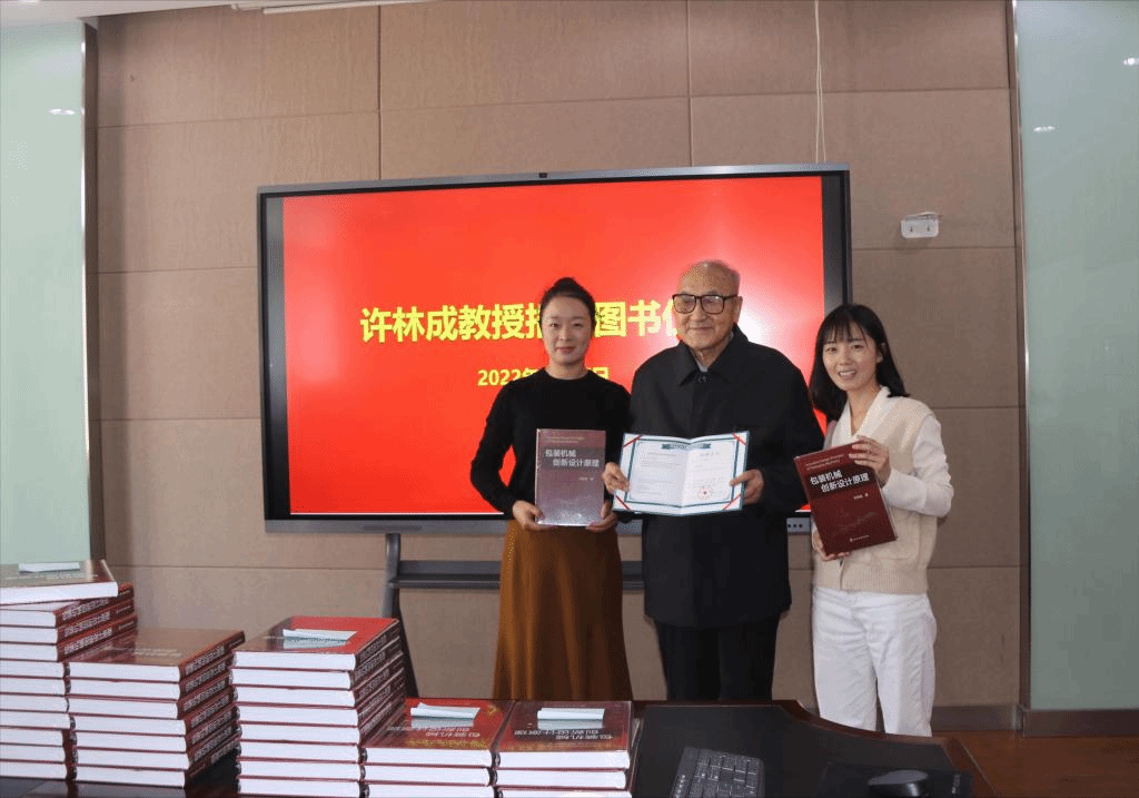 师生向许林成老先生献花。许老先生是无锡轻工业学院建院老教师,全国包装工程(主攻包装机械)高等教育创始人之一,中国包装工程学会授予包装科技教育终身成就奖,享受国务院政府特殊津贴。耄耋之年(91岁)再添力作,专著《包装机械创新设计原理》于2022年2月正式出版。接着,许林成老先生分别向图书馆、学院师生捐赠40本《包装机械创新设计原理》。陶岚代表校图书馆接受捐赠并颁发学校捐赠证书,学院师生代表一一接受老先生亲手赠书并合影留念。
