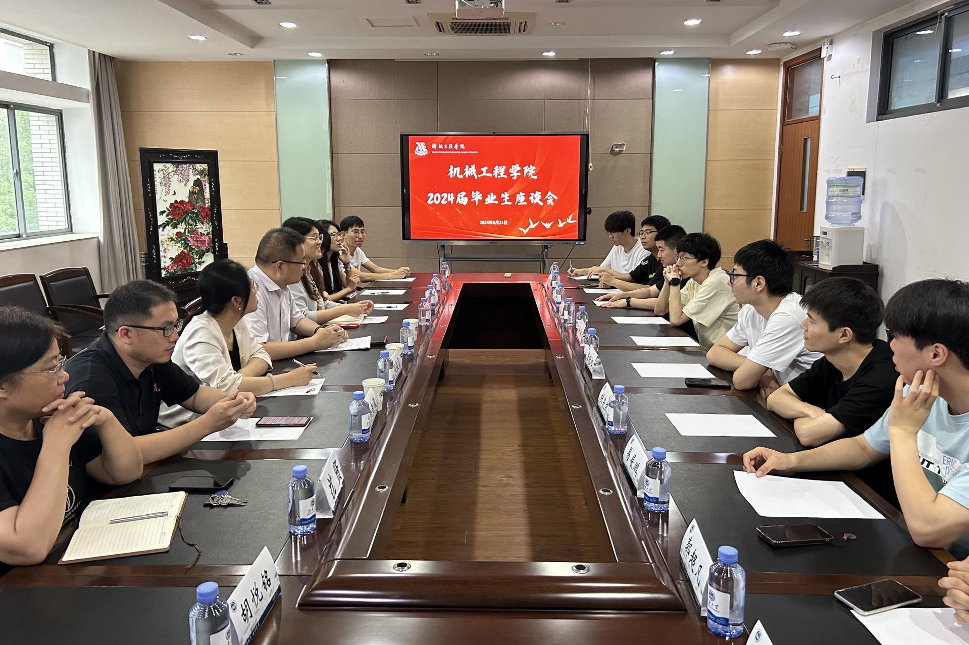 于学院C310会议室召开2024届毕业生座谈会。学院副院长钱善华,机械设计与制造系主任闫俊霞,过程装备与控制工程系主任杨新俊,教务办沈贤,学工办副主任、毕业年级辅导员潘智琦与毕业生代表参会。