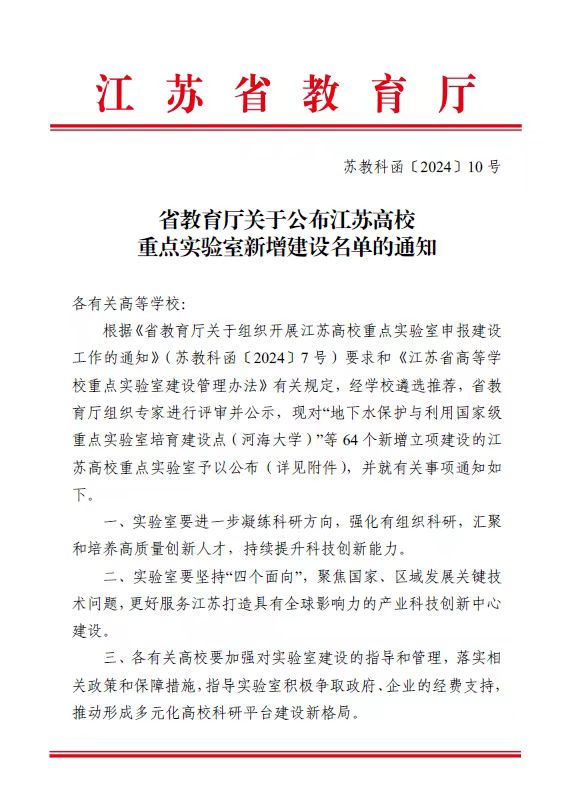 近日,江苏省教育厅下发《省教育厅关于公布江苏高校重点实验室新增建设名单的通知》(苏教科[2024]10号),正式批准了2024年度高校重点实验室64个。91在线