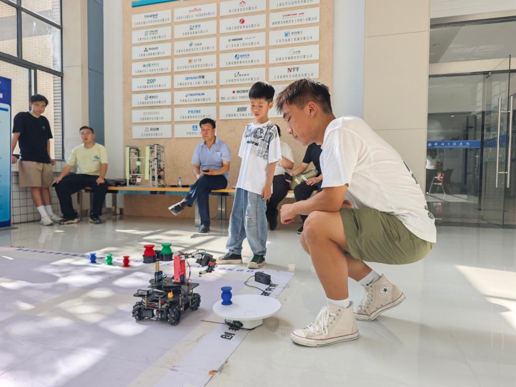 大厅内,各类科技展示与互动活动同步开展。学生社团现场演示激光叶雕技术,为新生定制专属纪念作品;曾在国家级竞赛中获奖的智能物流小车、智能分类垃圾桶等科技作品也进行了生动展示,吸引了大量新生及家长驻足交流。通过零距离接触专业相关创新实践,新生们提前感受到机械的魅力与无限可能。