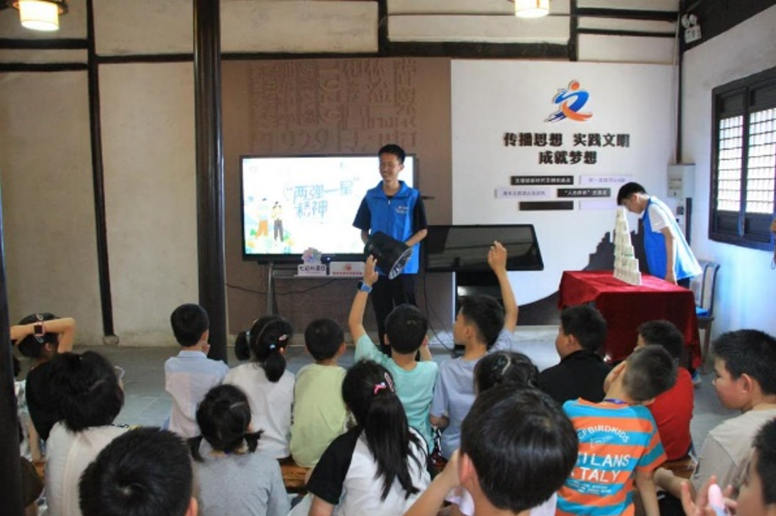 团队积极构建跨校联合宣讲网络,与河海大学等四所高校携手走进常熟市王淦昌故居,共同宣讲“两弹一星”精神,形成“一地多点、协同发声”的宣讲格局。同时,依托社区平台,面向中小学生开展科学家精神宣讲,将精神内涵融入故事与互动,让红色基因在青少年心中生根发芽。