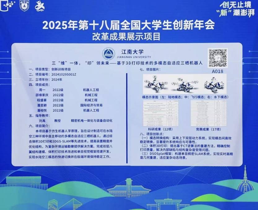 入选两项改革成果展示项目。项目一是《三“维”一体,“印”领未来——基于3D打印技术的多模态自适应三栖机器人》(指导老师:刘禹),基于仿生机器人学原理,设计一款可在水陆空三种环境中自主移动的多模态自适应三栖机器人,完成双层八翼结构建模、3D打印技术改进和单目视觉框架搭建开发,实现水陆空三模态的快速切换,为复杂环境运输勘察提供解决方案。项目二是《基于北斗卫星导航的智能播种小车创新设计》(指导老师:钱善华),针对目前我国小型农业播种机功能单一、自动化程度低、复杂地形适应性差等问题,创新设计了一款多功能智能播种装备,兼具轻量化、高精度、强适应性及低成本优势,适用于多场景作业,为中小型农田提供播种补苗一体化解决方案。